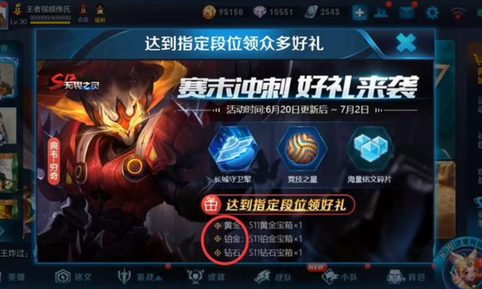第二个就是赛末冲刺的活动了,目前达到钻石段位的就快要领取3个宝箱了,宝箱快要开出竞技之星和一些其他的奖励。不过从下图可以看出新赛季可能7.3日开启,因为这个赛末冲刺活动时间是7.2日结束。
