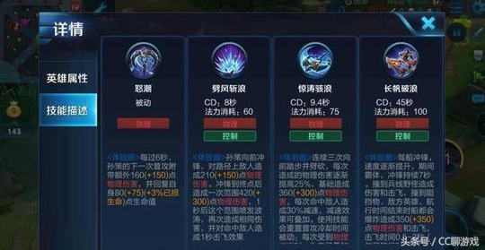 孙策向前冲锋,对路径上敌人造成物理伤害,冲锋到终点后造成一次范围物理伤害,1秒后这个范围喷发波涛,再次造成相同伤害,并对命中敌人造成1秒击飞效果。