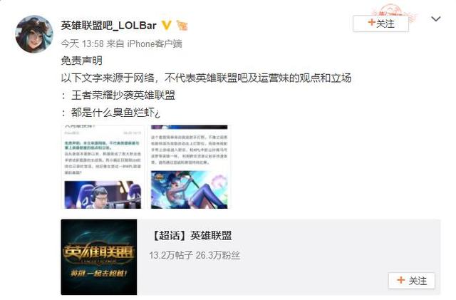 而就在今天,英雄联盟微博的官方超话主持人也是发布微博,在"免责声明"之后直接向王者荣耀开炮,直言:"王者荣耀抄袭英雄联盟"并且还说:"都是什么臭鱼烂虾?"