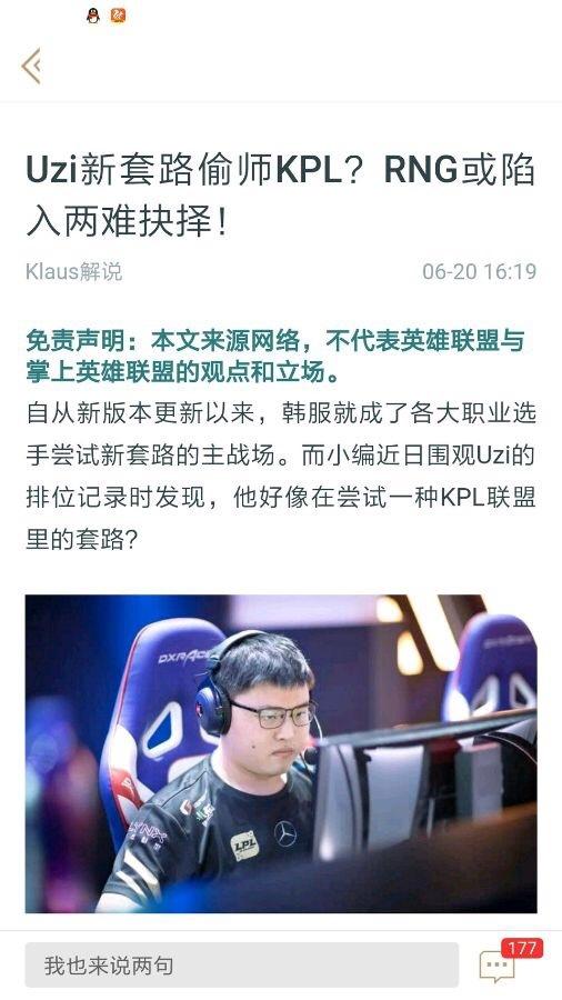 原因就是在网上的一篇文章中,一名小编写到"UZI新套路偷师KPL"(KPL就相当于英雄联盟的LPL),这样的措辞立马引起了众多网友的反感,而这其中就包括LOL超话的主持人。