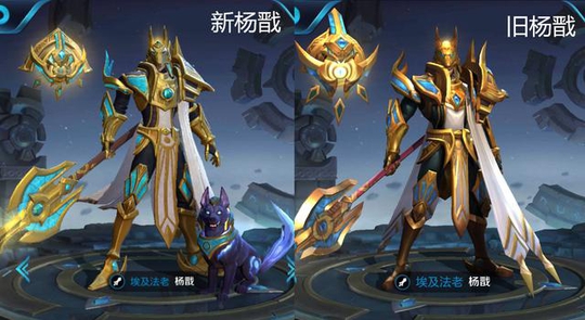 埃及法老对比:皮肤模型美术效果优化,从暗金色变成了亮金色,视觉上有较大提升。