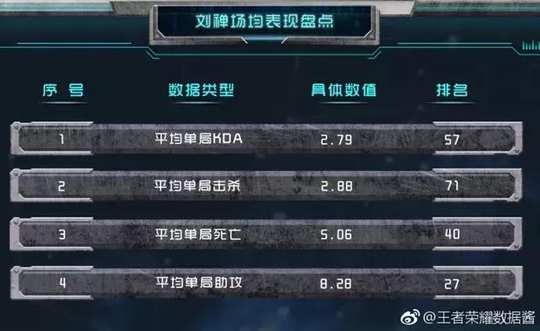 再来看看他的个人战斗数据,可以看到这几个数据中,无论是单局的击杀死亡还是KDA,都是在所有英雄当中排名相对比较低的。从数据上来看,这个英雄整体上并不算强势。