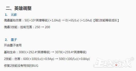 在6月18日的体验服更新中,元歌和墨子两名英雄遭到一定的调整。 其中元歌技能伤害和范围削弱,上次加强的墨子这次在基础生命和技能伤害方面也有一定削弱。