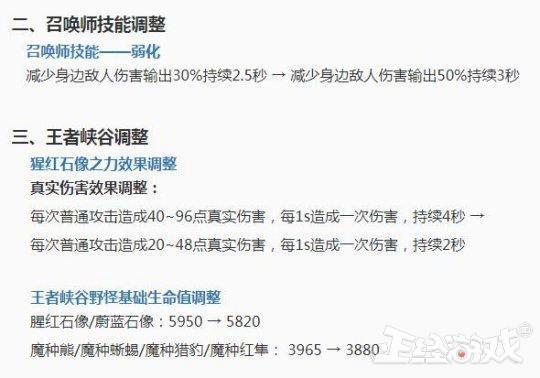 而在20日的更新中,召唤师技能和峡谷内的野怪也进行了一定调整。 召唤师技能”弱化”进行加强为减少身边敌人伤害输出50%持续3秒。红BUFF效果削弱,持续时间缩短以及真实伤害减少,几个野区怪物的生命值也进行下调。