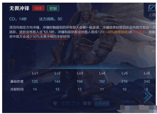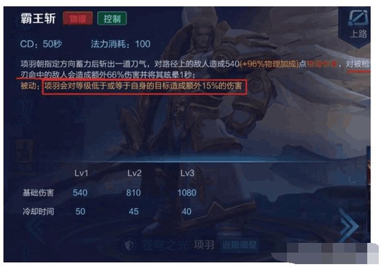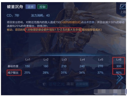 二技能——破釜沉舟:固定的7秒CD时间,造成高额物理加成的魔法伤害硬切减少30% 移动速度,以及随技能等级提升逐渐提升的对命中英雄的输出减少,最高可减少敌人40% 的输出伤害。这一技能配合被动的伤害减免,就是说项羽在生命值低于30%时二技能只要命中敌人,那么此刻的项羽相当于满血状态一般的肉,其减免伤害能力会达到一个非常恐怖的点,从而来实现精彩的反杀。