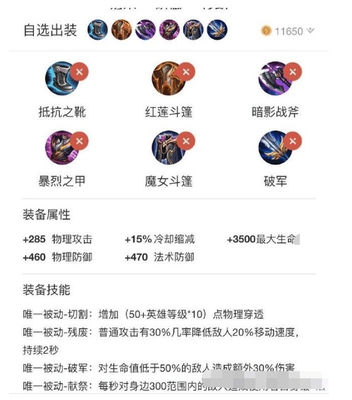装备推荐:抵抗之靴+红莲斗篷(后期可调整为不详征兆)+暗影战斧+暴烈之甲(必备)+魔女斗篷+破军(秒人核心装)。抵抗靴减少被控制时间,短手必出,红莲可以提高清线发育能力,前期也可提供多一点的输出伤害。暗影战斧提供破甲和攻击。暴烈之甲生命值越低伤害伤害越高,配合项羽被动简直是绝佳的反杀点。破军同样是不可缺的装备,当脆皮血量不足50%时,项羽往往可以通过一个贴脸大加普攻进行击杀。当然这一切都是在贴近敌人后才能完成的,所以我们使用项羽秒人时,一定要找到敌人走位失误的时候趁机贴脸一套带走。有的小伙伴会质疑项羽高端局胜率问题,小编以荣耀王者段位的水平告诉你,王者26以下项羽都可以拿出手并且Carry!所以赶快学习项羽的玩法去支配对局中的敌人吧。
