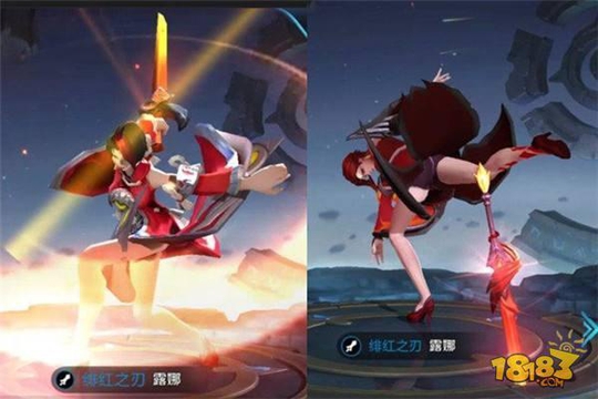 左边是旧版露娜绯红之刃皮肤,刀锋划过产生的刀气把露娜的下摆给吹得飞舞起来,从这个角度看,能看到露娜雪白的美腿。处处都充满着东方女性的优柔美。
