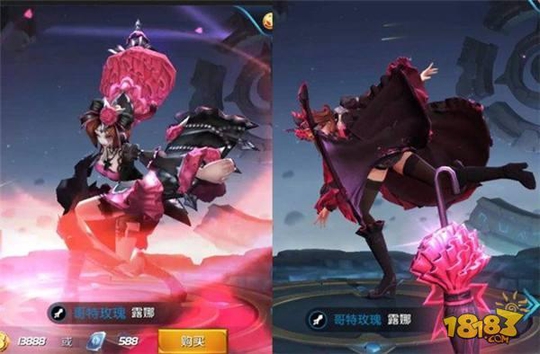 让我们在看看哥特玫瑰这个皮肤,左图的旧版露娜花伞划过之处带起一面刀芒,而她整体色调给人一种红的发黑的感觉,从图中可以看出旧版哥特玫瑰的裤子依旧是黑色,为何如此美丽的女子会如此喜欢黑色呢?