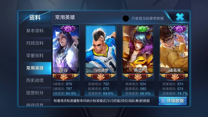 从常用英雄当中,我们可以明显的看出,这位大神擅长玩,刺客打野位置和法师位置,而且胜率几乎都是65%以上。玩的最多场次的是李白英雄,879场胜率保持64.9%,李白在这个赛季中,已经被削弱的没人敢在高端局拿出场,这位大神还能保持这样的胜率舒适不容易呀。还有马可波罗,韩信和诸葛亮三个英雄,这些英雄想要得到输出空间,都是需要考验玩家们的操作技巧。看到这样的胜率,职业玩家都甘拜下风。