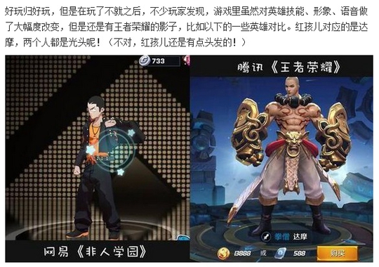游戏一推出,就有玩家立马开始站队了。(小编既不是腾讯派也不是网易派)表示《非人学园》在某些地方抄袭了《王者荣耀》,比如一些英雄的设定和技能上面。还列举了一些“相似”之处。