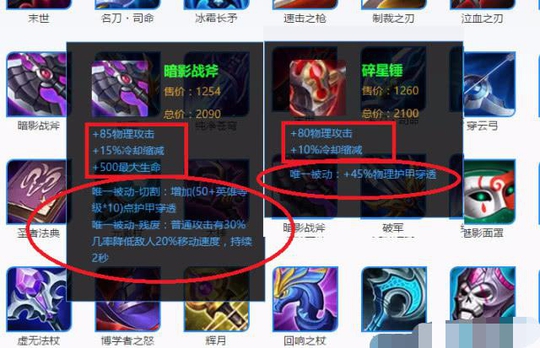 在对比完破晓和破甲弓后,我们再来看一下破甲弓和黑切之前的区别和联系吧!对比两者的属性,黑切比破甲弓多了5点攻击力和冷却缩减、500点的最大生命值以及一个被动减速的效果。除此之外,就是穿透效果了。经济基本相同,这样猛的一看,多数玩家都还觉得还是黑切给力吧?可事实上,并非这样,这就要从它们的穿透效果上来说了。