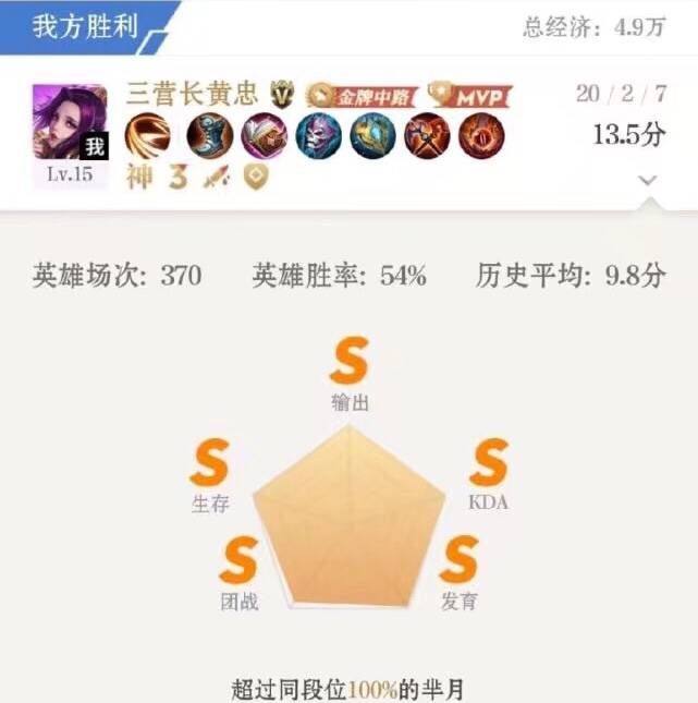 游戏结束后,总对于芈月这个输出感到好奇,进入王者荣耀助手看了之后,数据对线图是5个S,超越了同段位100%的芈月,就算是国服最强芈月,恐怕也没能力打出这样的战绩吧!