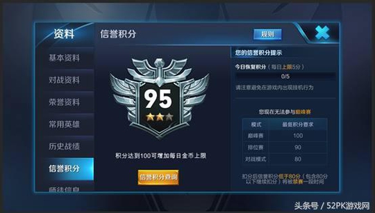 另外对于信誉积分的页面也进行了改动,每日恢复积分的的上线为5分,无论被减分前信誉积分为多少,只要低于80就无法参与对战,另外还增加了信誉显示,明确标注了每个模式可以参与的最低积分要求,将对局模式分档次,巅峰赛低于100分无法进入,排位赛低于90分无法进入,而普通对战模式则是基础的80分。