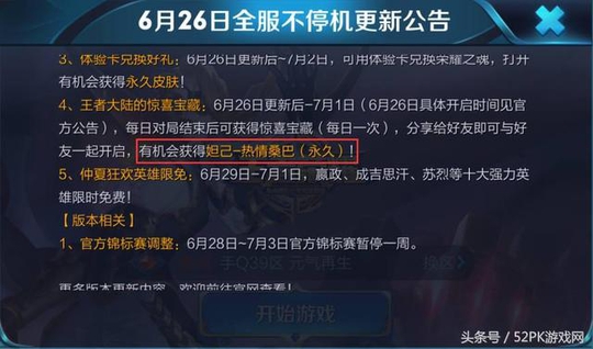 但是一眨眼的功夫,游戏公告又变成了有机会获得英雄。皮肤等精彩好礼!这变化堪称一绝了吧,本来有可能获得永久皮肤,但是公告一变就成了累计得体验卡。虽说永久皮肤难抽,大概率都是抽不到,但是目前来说这已经是获取桑巴的唯一途径了,每年夏天官方只会送一些体验卡来糊弄玩家,实在是令人非常不爽啊!