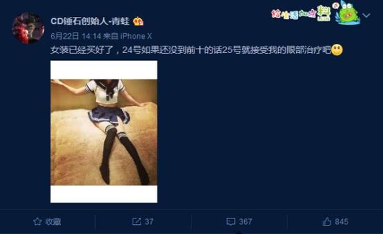 如果没能在6月24日直播结束前冲上国服峡谷之巅的前十名,青蛙将女装直播一天并送出一部IphoneX。其实相比于Iphone,观众们更加关心的是青蛙能否穿上女装,毕竟手机只有一部,而青蛙穿女装则是人人都可以看见的。