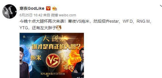 主要还是人缘好啊,在KPL的这么多年,很多职业选手和寒夜的关系都是极好的,只要有需要开黑的要求,都是会响应寒夜的,真爱了!对于自己搞的大盛宴,寒夜也是起了一个灵性的赛事名字:大腿杯!这要是不知道的,还以为王者荣耀真的又出了一个赛事呢。