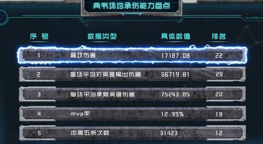 然后我们也可以看到,典韦的mvp率很高,从一个侧面也证明了他的强势,至于5杀次数,在全英雄中排名第12,这对一个战士来说还是很了不起的,你们现在了解典韦这个英雄了吗?说实话,现在是非常强势的,下赛季很可能被削弱,因此建议大家还是趁现在多玩一玩吧,欢迎大家关注和分享,继续带来大家更多的消息。