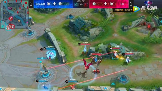 这场可以说输得非常的遗憾,前面拿到了超大的优势,基本人人都以为GK会赢得这局比赛,但最终还是输了。下图,在9分钟的时候,GK已经推到了Hero久竞的高地塔,在这种大顺风的局面竟然被翻盘,对于一个职业战队和现场的粉丝观众来说,都是很难接受的结果。