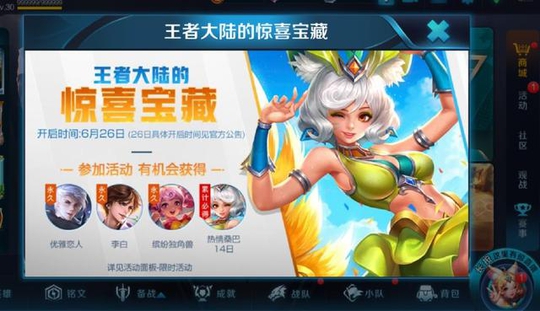 昨日王者峡谷上线了一个吸引力非常大的活动,那就是王者惊喜宝藏!召唤师们还有机会获得优雅恋人以及李白跟缤纷独角兽永久,以及妲己的热情桑巴14天的使用权。