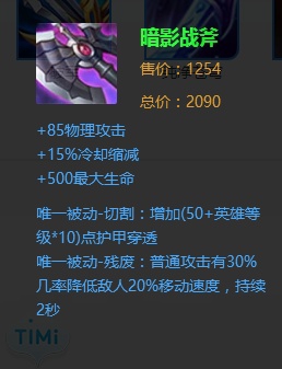 暗影战斧这个装备,是战士第一个做的装备,也是很多战士前期的核心装备,在王者荣耀游戏中比如:赵云、宫本、凯、花木兰、杨戬、达摩这些战士型英雄首选黑切,但是在后期真的没有什么用,被动的200点物理穿透再后期的作用真的没有破星锤的45%的物理穿透来得实在,如果到后期这个装备能卖掉换破星锤尽量换掉,后期不缺那一点秒杀脆皮的伤害。大神都把这个装备在后期视为鸡肋装备。