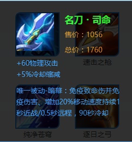 这个装备列在这里可能有点争议,其实是这样的,因为后期高手都是人手复活甲,都不会把这个装备换在6个格子的装备栏,这个装备都是后期的预购装备,一般是复活甲打掉了之后,站起来秒换名刀,法师开了辉月之后,在辉月生效的时候,把辉月卖了换成名刀,甚至连辅助钱多都可以这样玩,辅助出一个血魔之怒,触发血魔之怒的被动之后,把血魔卖掉之后还有30%的护盾值,然后换成名刀,或者复活甲。大神们都是这样的操作,绝对不会把这个装备换在6个格子装备栏,因为便宜,后期随便卖一个大件都能换得起。