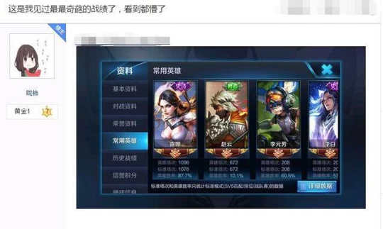 玩家把当时露娜队友的战绩晒了出来,那局比赛里露娜的玩家操作非常细腻,在敌方五人里面飞来飞去,先杀脆皮再杀肉盾,真的是行云流水,如果不是有露娜来带节奏,玩家估价那盘早就输了,比赛当然是赢的,后面玩家马上看了一波队友的数据,结果一看吓坏了,露娜胜率确实很厉害,1096场比赛胜率居然高达87.7%证明技术真的很厉害了,但第二个赵云的胜率也吸引了许多玩家,毕竟赵云的胜率只有10.1%,而且比赛局数已经是672场了,看来坑了不少人啊.