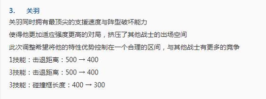 关羽在S11赛季的出场率相当不错, 是很强势的一个边路英雄,在此次更新中,其一三技能的击退距离以及大招的碰撞框长度都是减少了100,相信这个应该会让其在S12赛季不再这么热门!