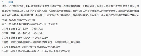 甄姬在这次更新中可以说是史诗级加强了,在以后绝对是T0级别的法师,优先级跟张良,干将莫邪差不多了,不仅技能的蓝耗得到减少,并且大招将会直接推开非英雄单位,命中英雄将会发生爆炸!