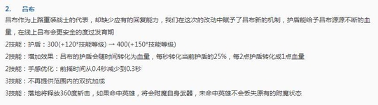 作为峡谷第一战士,在当前版本他的出场率并不是很高,在这一次更新中,其二技能的护盾增加很多,并且还多了一个效果,会随着时间慢慢转化为血量,在以后他的续航能力将会大大增加!而三技能虽然没了双抗加成,但是在落地后却会释放360度斩击,命中低疼直接附魔,也是特别的牛掰!