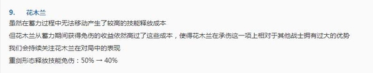 在当前版本之中,花木兰绝对可以说是T0级别的战士,出场率相当之高,所以官方将其免伤减少了10%,其他却没什么改动,应该让很多玩家都大圩了一口气,毕竟在之前的两次调整可是要吓死很多人啊!