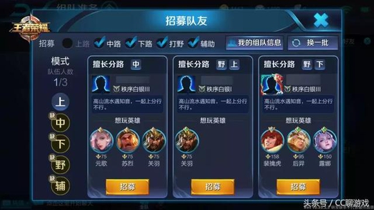 队友招募界面增加了召唤师想玩英雄的荣耀战力展示,并且会实时展示当前队伍缺少的位置,组建一个搭配合理的阵容更加直观方便了。
