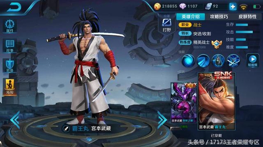 宫本武藏虽然不是SNK授权的英雄,但他的皮肤霸王丸却是王者荣耀中第一个SNK授权的皮肤,同样也是王者荣耀中至今为止最后的一个SNK授权的皮肤,而宫本武藏的名字看起来也是一个日本的名字。宫本武藏有着不少的皮肤,而免费赠送的白色的霸王丸虽然没有办法与宫本武藏的地狱之眼相比但是与其宫本武藏其他一些皮肤相比,无论是特效还是手感上来首都是丝毫不弱的。