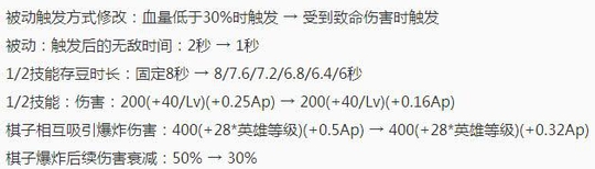 奕星的优化也很多,被动可以说完全变成名刀了,而1,2技能的伤害变低,不过后续衰减也变低,并且1,2技能还多了一个爆炸命中增加奕星法强攻速的效果,看来他是已经彻底变成一个消耗法师了。