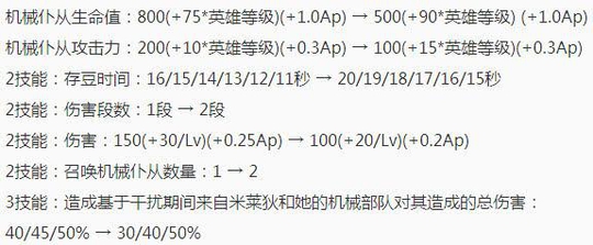 米莱狄这种新英雄,肯定是要平衡的,这次平衡的幅度很大,机械仆从的生命有一定的削弱,但2技能能直接召唤2个了,大招也削弱了一点,整体来说是比以前稍微弱了一些。
