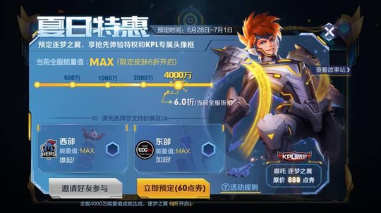 在预定活动进行到一个半小时后,全服能量值就已经达到了4000万的节点,全服开启6拆活动,并且在15点时,全服能量值就已经达到了MAX顶值,皮肤将会在2018月7月8日12:00在游戏内正式售卖,原价888点券。