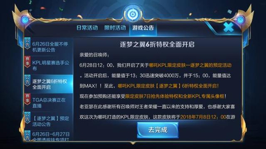 哪吒的新皮肤预定活动的限定时间为6月28日至7月1日,预定哪吒的新皮肤可以有预先体验逐梦之翼和KPL专属头像框。这次的活动与之前马可波罗新皮肤预定的方式一样。