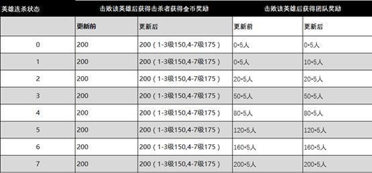 英雄的赏金也根据游戏节奏分为了三个阶梯:除1血固定为255金币外,4级前赏金为150金币;4~8级为175金币,8级之后才是200金币。而当英雄进入超神(超鬼)的连续击杀(死亡)状态后,也需要多次被击败(助攻)后赏金才会回归正常值,有效避免了个别玩家一怒送人头的情况,超神玩家也需要更为谨慎的操作来避免成为敌方的长期提款机。