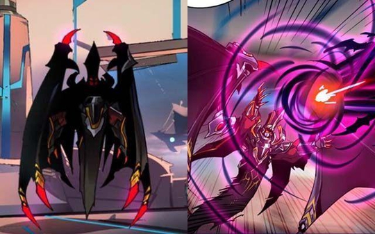 如上图,神秘人首次出现在元歌故事背景里的时候,整个身体都是被盔甲包裹着的,身后还有这一对锋利的机械翅膀,就连脸部都是那种全封闭状态的头盔,一看就是反派角色。