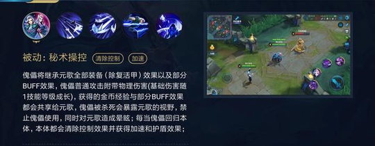 元歌分离出一个傀儡,这个傀儡能继承元歌的所有装备(除复活甲)。每当傀儡回归本体还能清除眩晕效果外加护盾,怎么样单单是个被动都那么拽。