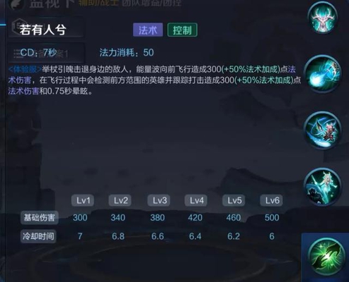 1技能若有人兮,1技能属于攻击消耗技能,具体释放方式应该是瑶发出一个能量波,能量波在飞行的过程中还会自动追踪打击前方范围的英雄,再次造成法术伤害和眩晕(这个效果有点类似甄姬的2技能效果)