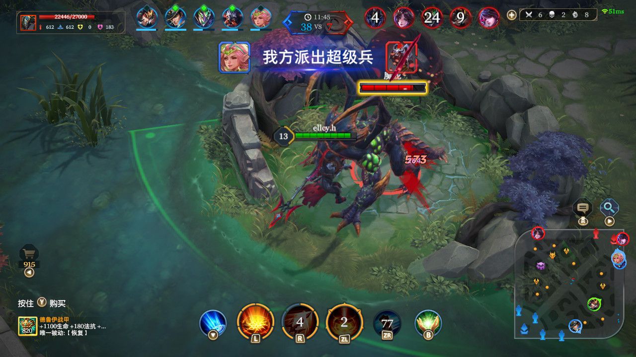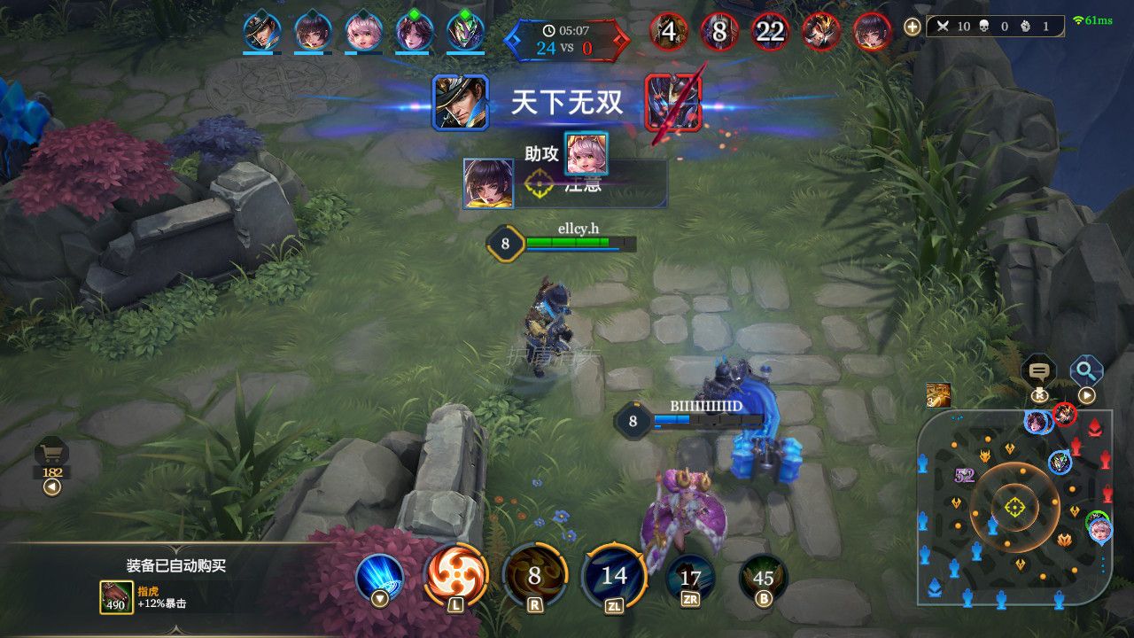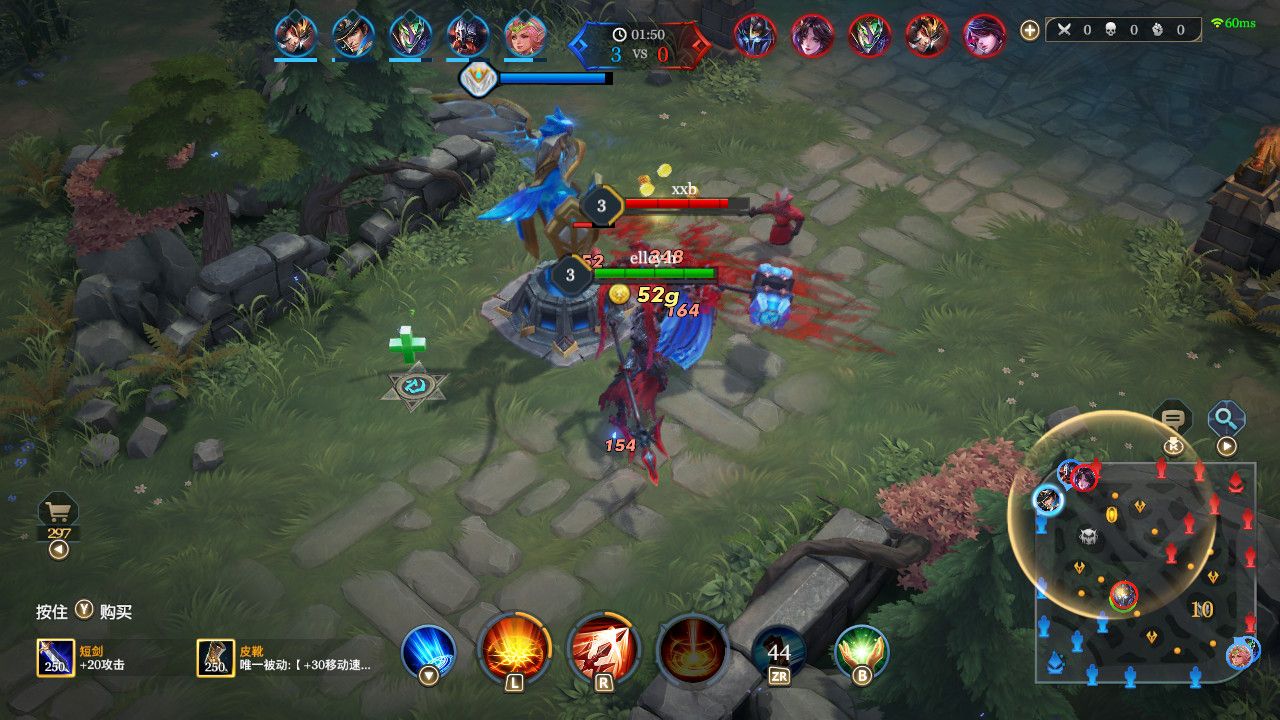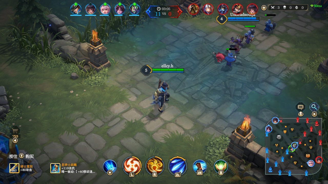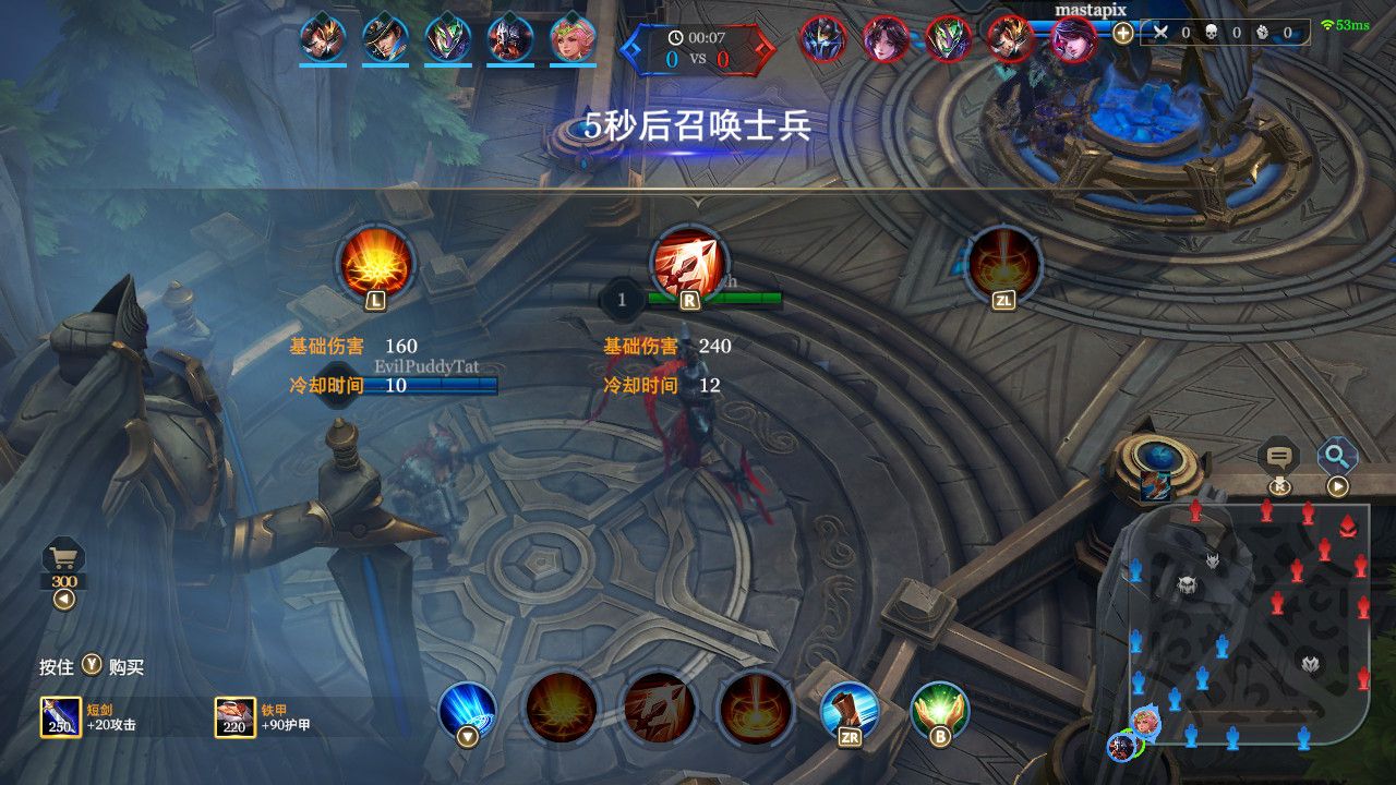《王者荣耀 海外版》需要操作的部分不算少,三个主动技能,两个挑战者(召唤师)技能,外加普攻、回城、商店、发送讯息等功能被紧凑地安排在了各个按键上。频率最高的主技能置于肩部 L、R、ZL,可以在食指按下的同时用右摇杆调整释放方位,比手机版里按住技能框然后艰难拖动要便捷太多。另外,取消释放只须在按住技能键同时按下 B 键就可以,误操概率降低不少。