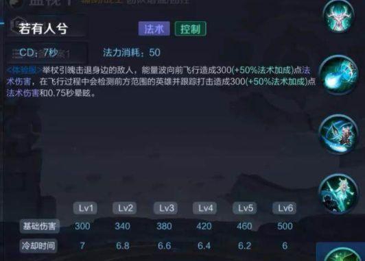 1技能若有人兮,1技能属于攻击消耗技能,具体释放方式应该是瑶发出一个能量波,能量波在飞行的过程中还会自动追踪打击前方范围的英雄,再次造成法术伤害和眩晕(这个效果有点类似甄姬的2技能效果)