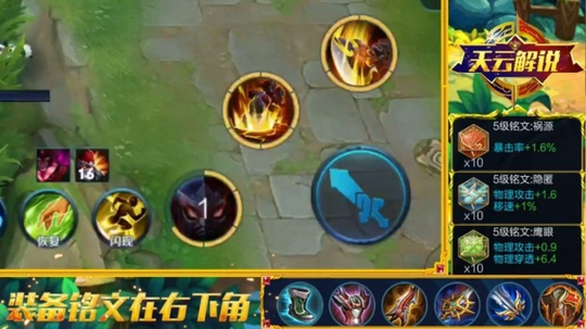 在高端局之中,笔者推荐上面这一套半肉装,因为只有这样才能在团战之中生存,并且靠近脆皮,不至于瞬间就被秒杀,而且火甲可以放到后面出,中期先补上无尽,宗师等暴击装备!而铭文方面则推荐祸源+隐匿+鹰眼,没有必要带狩猎,因为典韦的二技能是瞬间增加200%的攻击速度!