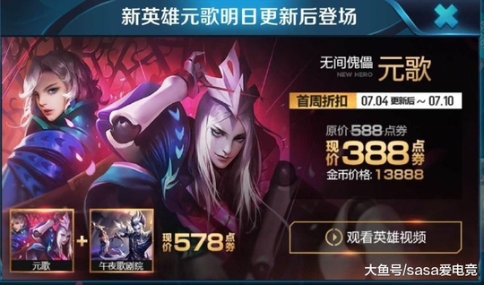 另外新英雄元歌也将会在明天更新后正式上线。之前这款皮肤一直备受争议,甚至有传言说他将会以水晶的形式出现。现在官方也正式宣布了他的价格,他的定价是13888金币。值得一提的是继诸葛亮之后,上线的英雄都是13888金币,没有其他金币的英雄,是不是意味着以后上线的英雄都是13888金币呢?另外,元歌与他的皮肤午夜歌剧院明天打折只需要388点券。
