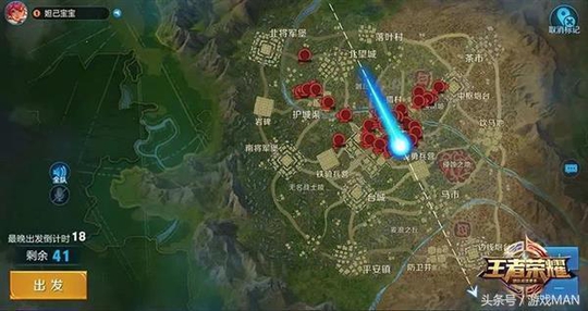 在出生路线(图中虚线)行进到达自己中意的区域时,点击【出发】按钮就可操作轮盘调整自己的出生点。需要注意的是,新模式中的地图大小相当于150个王者峡谷,各位召唤师们需要好好规划选择出生点