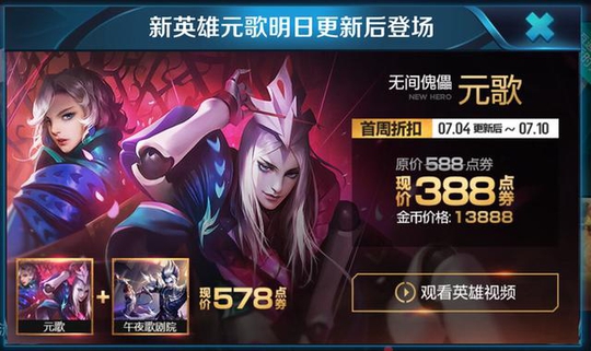 元歌原名庞统,原售价18888金币,现调整到13888金币在明天上线!小伙伴们的金币准备好了没呢?
