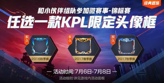 参与官方锦标赛,换3种KPL限定头像框,活动7月6日开启,参加锦标赛,完成指定场次即可获得锦标赛勋章,每天最多可以获得10个。可以兑换的KPL限定头像框分别为2017秋季赛KPL限定头像框、2017春季赛KPL限定头像框、2016秋季赛KPL限定头像框,都是20个勋章。
