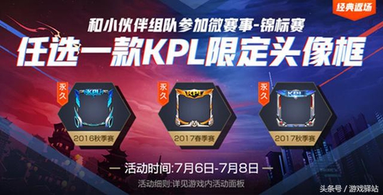 活动二:7月6号至10号期间玩家参与官方锦标赛收集勋章可兑换头像框和铭文碎片奖励,前者包含了三款KPL限定皮肤头像框,兑换其中一款需要20个勋章!