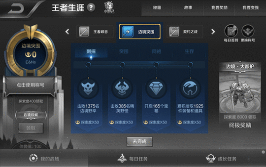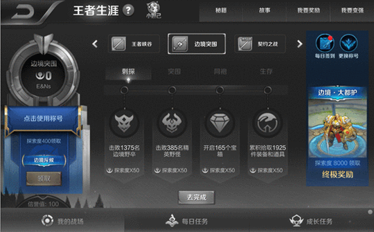 2. 积累各个战场探索度,可以领取专属于各个战场的“局内称号”