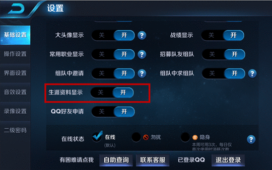 2. 对于注重隐私的召唤师,亦可在大厅设置 – 基础设置 – 生涯资料显示中来开启或关闭自己的生涯对他人的可见性